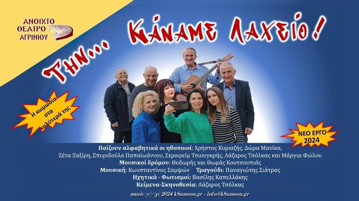 Η παράσταση έχει τον τίτλο "ΤΗΝ... ΚΑΝΑΜΕ ΛΑΧΕΙΟ!" και έκανε πρεμιέρα στο Παπαστράτειο Μέγαρο Αγρινίου την Τετάρτη 17/4/24 σε μια θερμή και κατάμεστη αίθουσα.