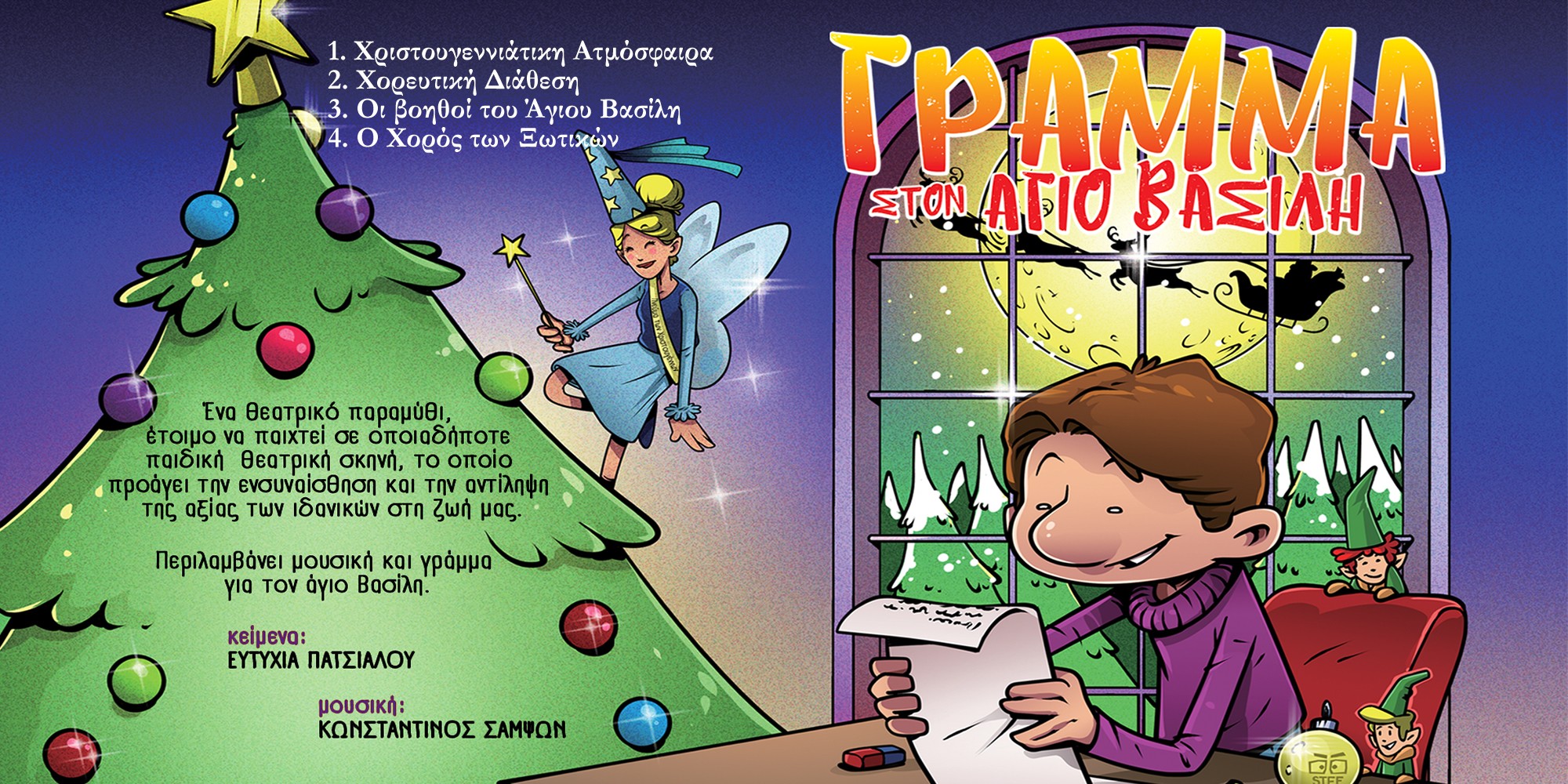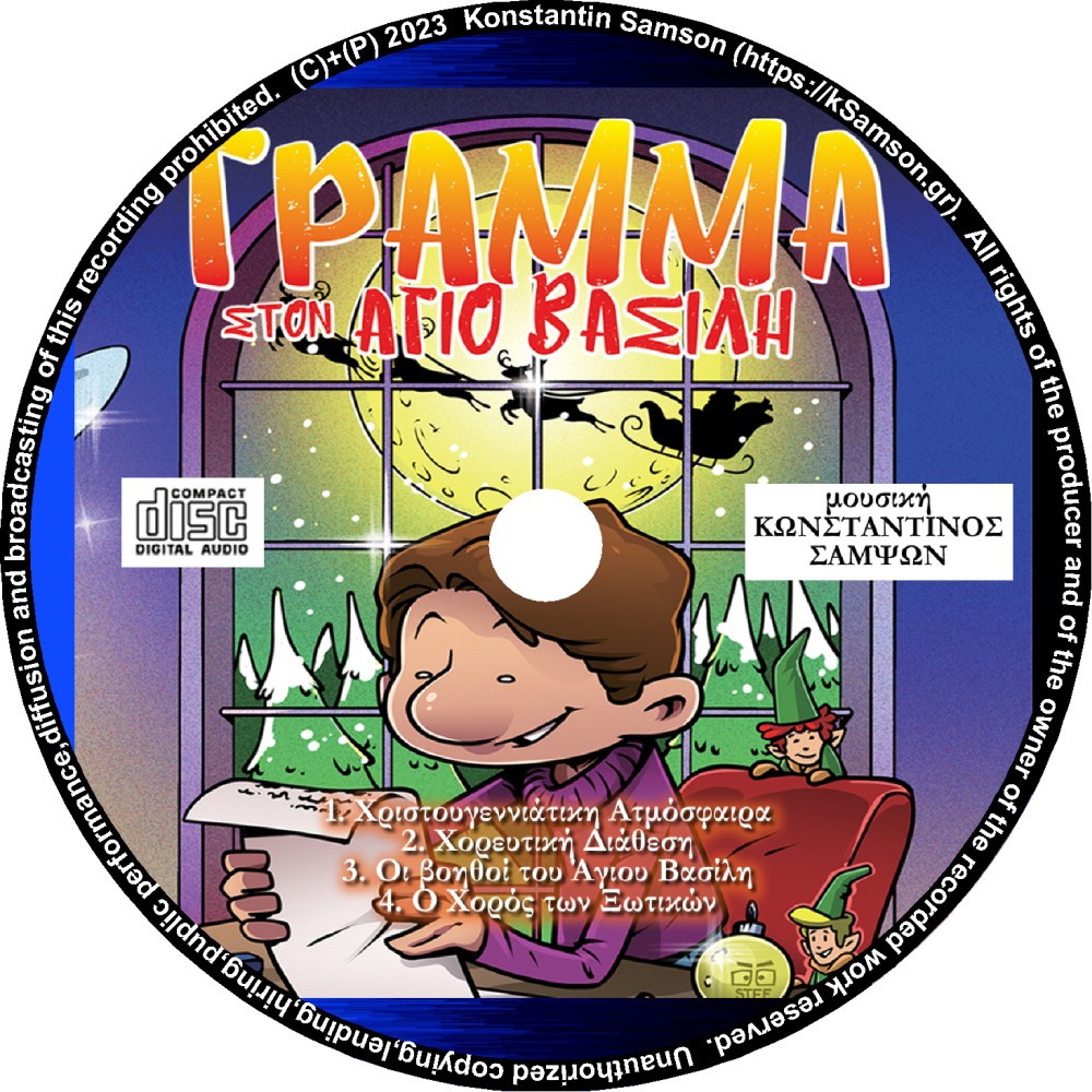 Μετά τη μουσική επένδυση της κινηματογραφικής ταινίας μικρού μήκους "Το κίτρινο μπλουζάκι" και την μουσική επένδυση για την θεατρική παράσταση της συγγραφέως Ευτυχίας Πατσιαλού "ΤΟ ΛΕΥΚΟ ΚΟΡΑΚΙ", ο Κωνσταντίνος Σαμψών επανέρχεται με την μουσική επένδυση για μια ακόμη θεατρική παράσταση της Ευτυχίας Πατσιαλού με τον τίτλο "ΓΡΑΜΜΑ ΤΟΝ ΑΓΙΟ ΒΑΣΙΛΗ". Το έργο αυτό περιλαμβάνει τέσσερις ορχηστρικές συνθέσεις εναρμονισμένες με το πνεύμα των Χριστουγέννων και της Πρωτοχρονιάς.
