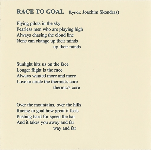 Όπως φαίνεται και από τους τίτλους, υπάρχει έντονο αεραθλητικό ύφος. Ο στίχος είναι αγγλικός λόγω της πιθανής χρήσης του στο Πανευρωπαικό Πρωτάθλημα PARAPENTE.