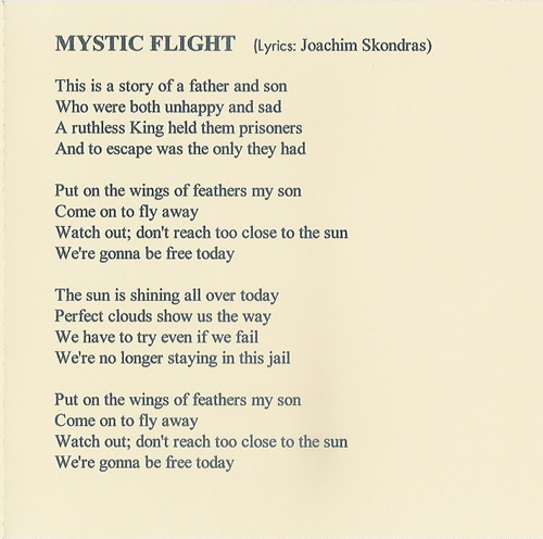 Τους Στίχους έγραψε ο Ιωακείμ Σκόνδρας, ο οποίος βοήθησε και στην συνολική επεξεργασία του έργου. Ο ίδιος επίσης ερμήνευσε το κομμάτι Mystic Flight. Σημαντική βοήθεια σχετικά με την ενορχήστρωση, δέχτηκα από τον Μουσικό μου Δάσκαλο Κώστα Γκίκα τον οποίο και ευχαριστώ πολύ. Επίσης ευχαριστώ πολύ την Διόνι Γκίκα που συμμετείχε φιλικά στην ολοκλήρωση του έργου, ερμηνεύοντας το κομμάτι Race to Goal.