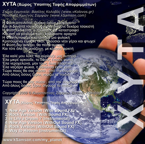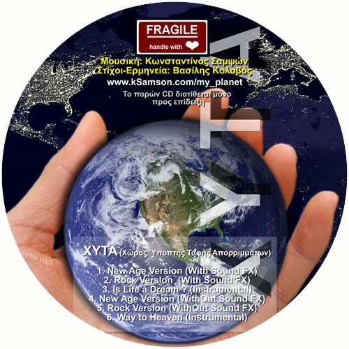 Αφιερωμένο στην παγκόσμια ημέρα περιβάλλοντος (5 Ιουνίου), παρουσιάζουμε το παρών μουσικό CD + βίντεο κλιπ με σκοπό να ευαισθητοποιήσουμε τον κόσμο (κυρίως τα παιδιά) σχετικά με το φαινόμενο της μόλυνσης του περιβάλλοντος που μαστίζει την εποχή μας.